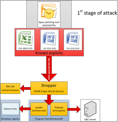 Cloud atlas is delivered by spear phishing mail and then exploits the vulnerabilities known CVE-2009-3129 (MS Excel),CVE-2010-3333 (MS Word)andCVE-2012-0158 (MS Word) that lets it to execute malicious shellcode embedded with document and then continue its infection chain.