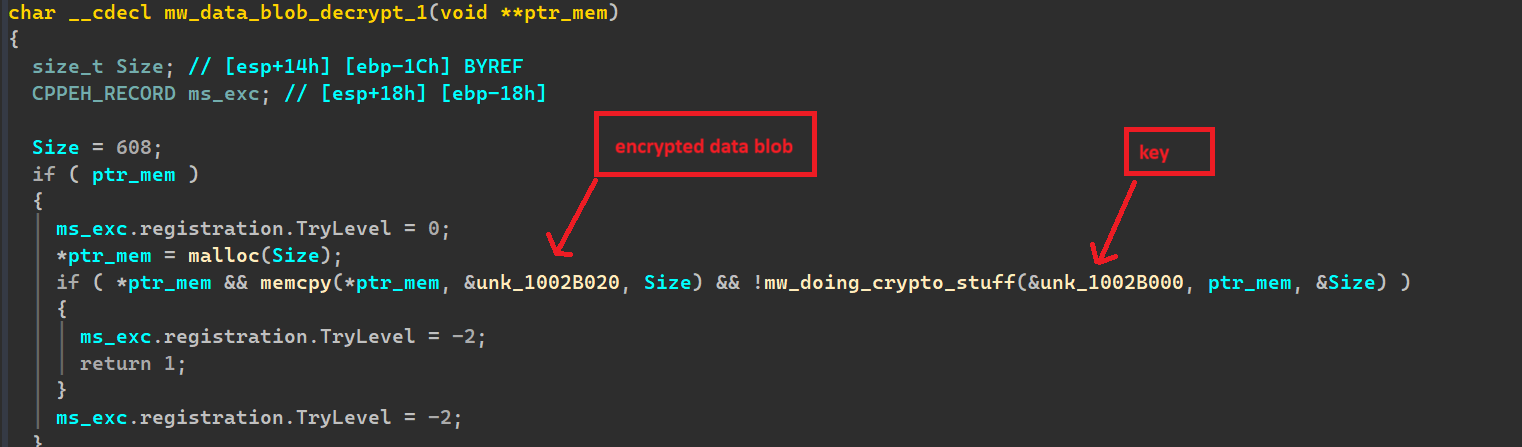 The malware before parsing and C2 communication decrypts a large blob of data embedded with it , and it seems to be the C2 configuration