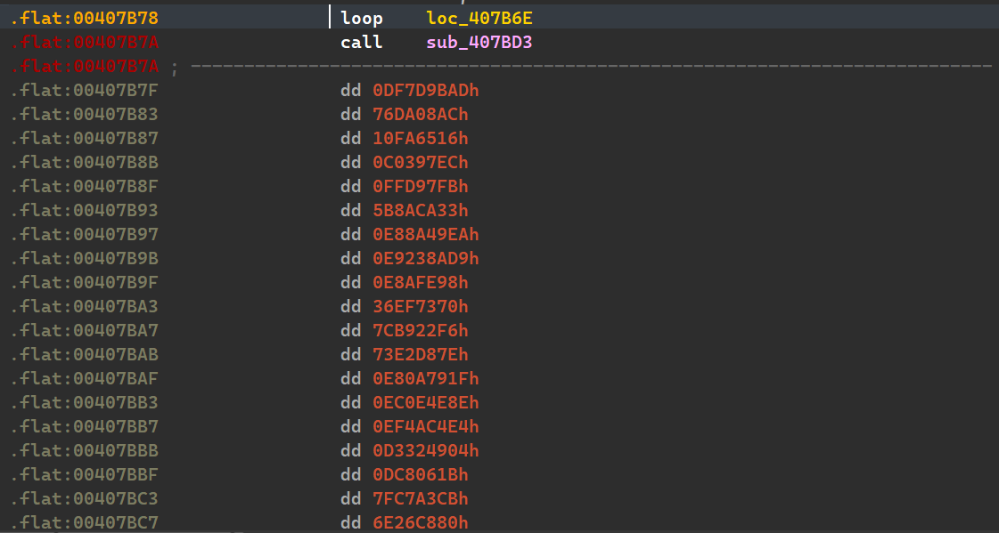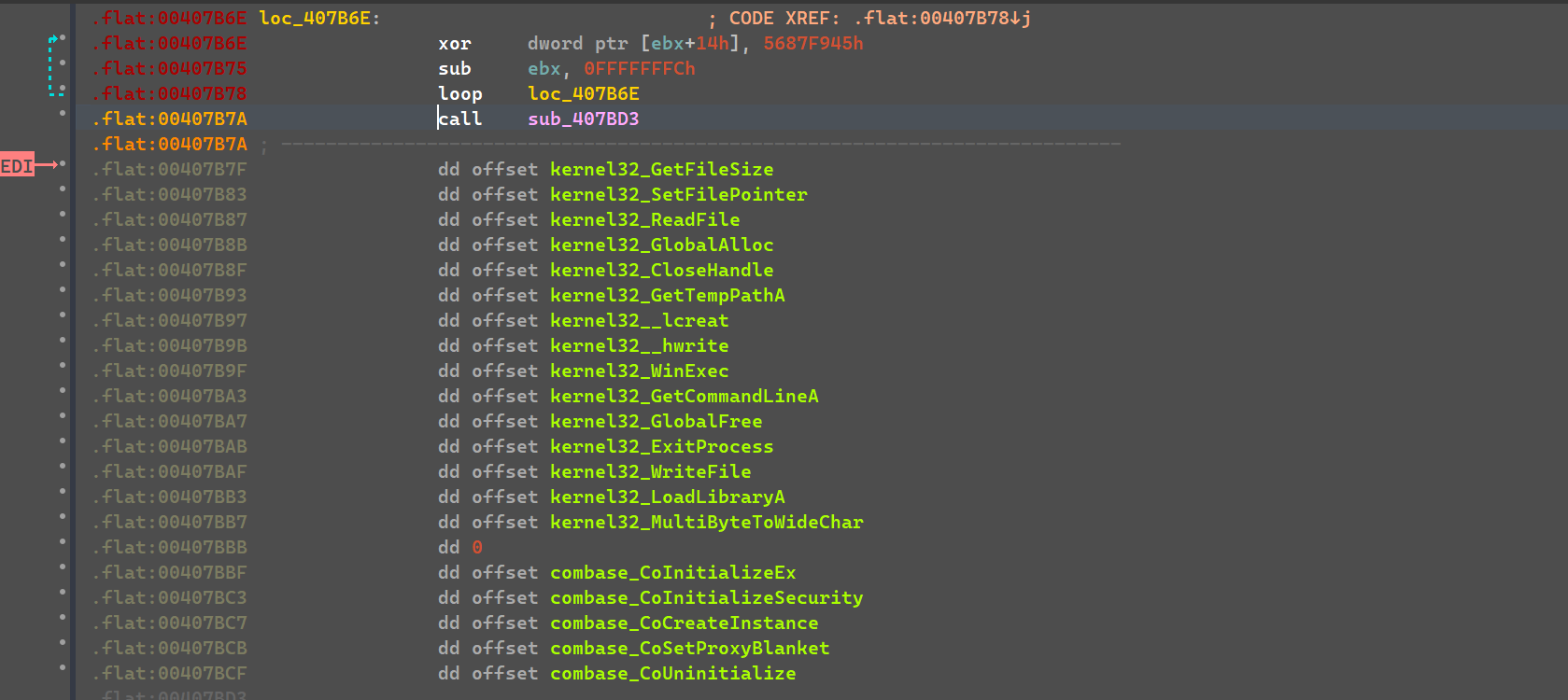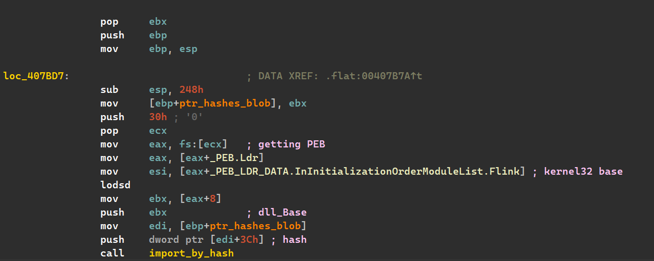 After decryption we have function call sub_407BD3 and some encrypted data after it , after we have entered the function it accessing PEB then loaded modules to get the kernel32.dll , and then passed to function with pointer to decrypted data under sub_407BD3 which seems to hashes and it will be resolved to do shellcode functionality.