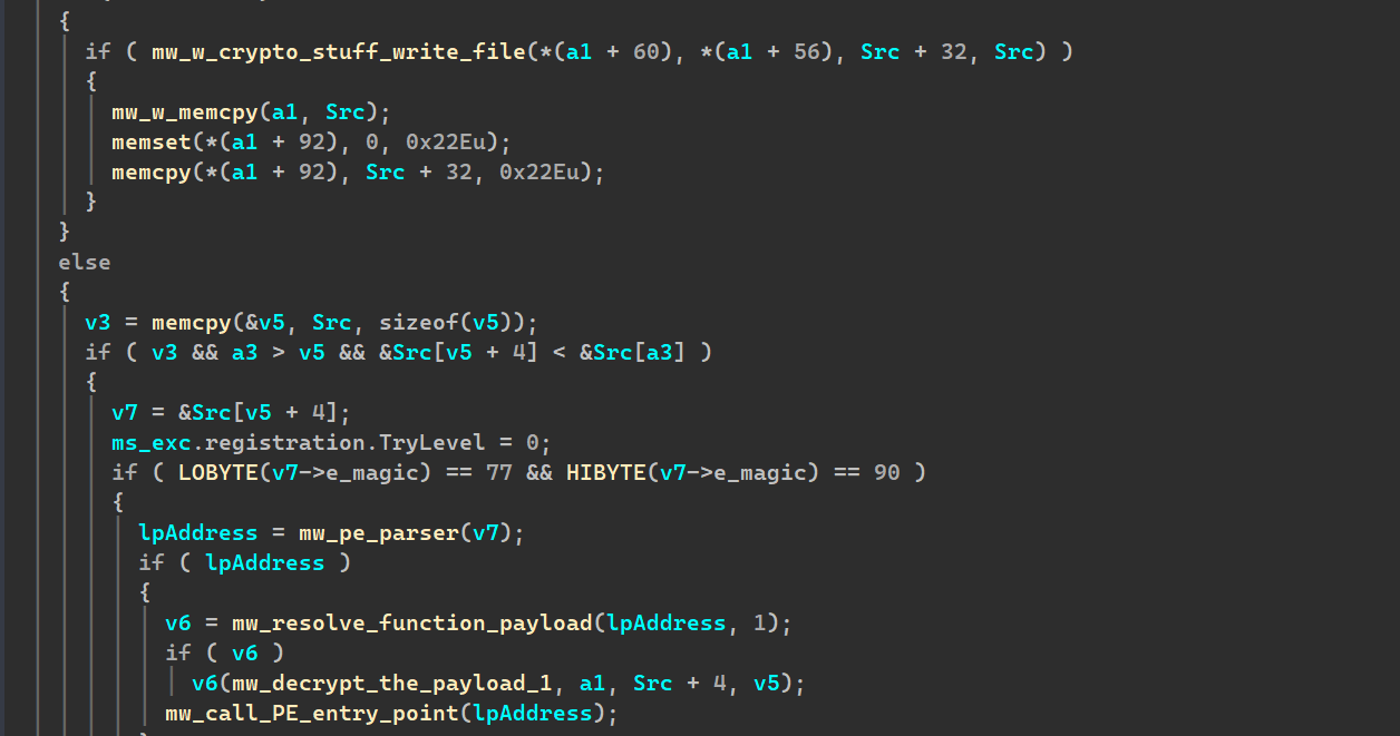 As expected it tries to parse PE , and around it there is heavily crypto functions to decrypts the contents before parsing and after it also! , after successful PE parsing and decryption the malware will call the payload entrypoint.