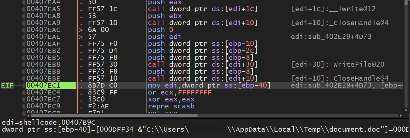 RTF format , So I will have a look on the document physical offsets and dump to find anything related to shellcode start. After using rtfdump I have noticed there is object called Reminder with physical offset 0x6B52 so I started searching from there for shellcode or something related to position-independent code. RTF dump result After examining that offset here we go , we have some NOPs and valid opcode such as