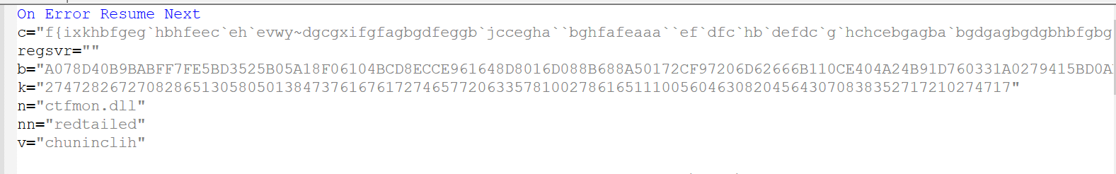 This VBs script it seems to decrypt and drops other stages , here we have interesting strings such as ctfmon.dll and redtailed , also large encrypted blob of data c.